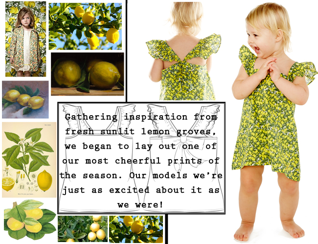 Over the next few weeks, I’ll be taking you behind the scenes of the design process for my favorite pieces. Today I want to introduce my lovely Lemon Blossom Print. I was inspired by the intricate patterns that surrounded me growing up in London, with a bit of a twist. This is the perfect cheery print for your peppy little girl. I can’t wait to see both Bridget and Vivienne toddling around in these gorgeous printed bloomers and toddler sundresses this summer! Read on for the details…