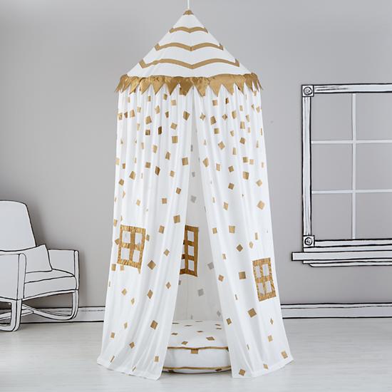 Canopies and tents are gorgeous and, these days, come in so many beautiful colors and prints. They are also so much fun for games of peek-a-boo and, then as your child grows older, for night time stories and pirate or princess tea parties! They also work perfectly for keeping a nursery neat because, when you don”t have the energy to clean up, they can be used to hide all the stuffed animals, books laying around and any other things you just don”t know where to put!